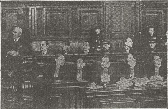 На скамье подсудимых (слева направо) – С. Литвинов, М. Иоффе, В. Либориус среди жандармов; внизу – адвокаты Возрождение. Париж, 1930. 22 янв. (№ 1695)