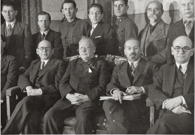 Руководители Народного комиссариата по иностранным делам СССР. 1933 Сидят (слева направо): первый заместитель наркома Н. Н. Крестинский, нарком М. М. Литвинов, второй заместитель наркома Л. М. Карахан, член коллегии Б. С. Стомоняков