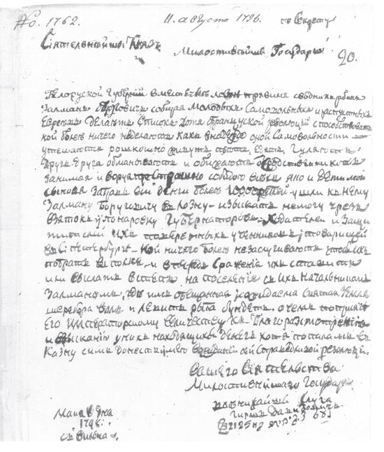 Донос мещанина Гирша Давыдовича на хасидского руководителя Залмана Боруховича (рабби Шнеура Залмана). 1798