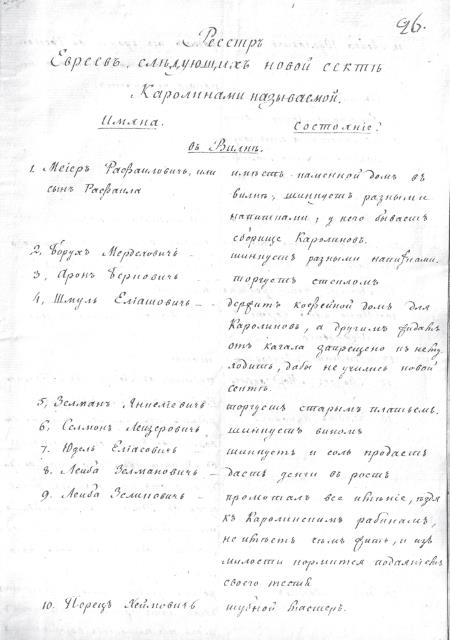 Фрагмент реестра арестованных по доносу евреев-хасидов. 1798 РГАДА. Ф. 7. Оп. 2. Д. 3140. Л. 26