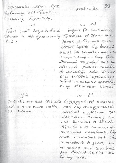 Фрагмент вопросов и ответов Залмана Боруховича на первом следствии. 1798 РГАДА. Ф. 7. Оп. 2. Д. 3140. Л. 32