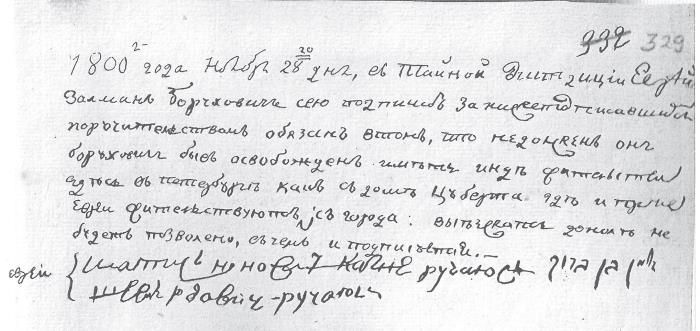 Расписка Залмана Боруховича, оправданного по второму следствию, с обязательством оставаться в Санкт-Петербурге до особого распоряжения. 1800 РГАДА. Ф. 7. Оп. 2. Д. 3140. Л. 329