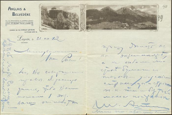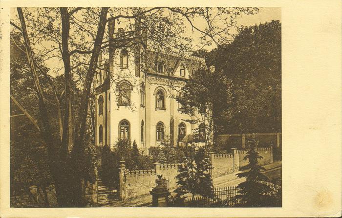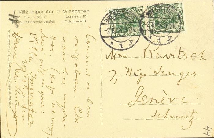 Открытка Шолом-Алейхема Сарре Равич от 2 августа 1913 года Фото на лицевой стороне: пансион «Villa Imperator» в Висбадене РГАЛИ. Ф. // 96. Оп. 1. Ед. хр. 21. Л. 44–44 об.