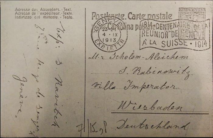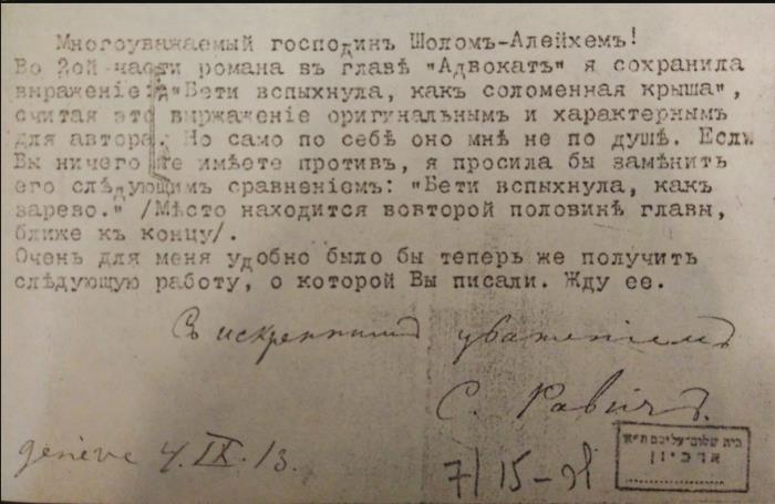 Открытка Сарры Равич Шолом-Алейхему от 4 сентября 1913 года Beit Shalom Aleichem. LR-15/7