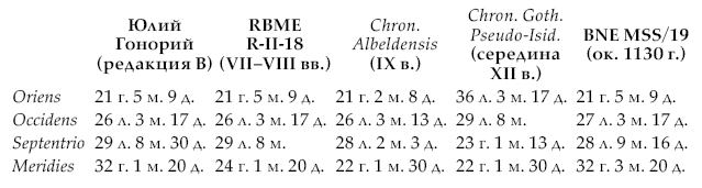 Сказано, что Юлий Цезарь был единовластным повелителем мира. Его мировое господство стало полным, когда он подчинил себе Пиренейский полуостров. Большую роль в этом завоевании сыграло сооружение Августовой дороги, связавшей Пиренеи с Севильей и позволившей римским войскам покорить население полуострова. После этой анекдотической реконструкции правления Юлия Цезаря в Chron. Goth. Pseudo-Isid. следует довольно подробное изложение вступительного фрагмента «Космографии», то есть рассказ о том, как четыре мудреца (sapientissimi et electi viri) измерили мир. Имена этих мудрецов указаны в тексте несколько иначе и в другом порядке. Так, исследователь юга Тодора (Теодот в «Космографии») из последнего становится третьим, а за ним следует исследователь севера – Пелагий (Поликлит в «Космографии»). Хотя в Chron. Goth. Pseudo-Isid. отсутствуют имена консулов, которые оригинал использует в качестве хронологических референтных точек, здесь указано время, когда каждый из мудрецов измерил назначенную ему часть света. Следовательно, этот пассаж не мог быть взят из арабского Орозия, потому что там указано лишь время, которое заняла вся операция (30 лет), да и то вскользь[1252]1252