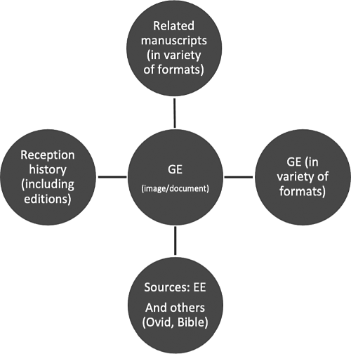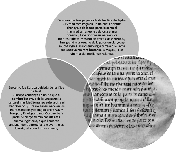 Таким образом, можно предположить, что эти же элементы связаны в издании GE, но на этот раз иерархия работает в другом направлении. В итоге, издание знания о чем-либо (в данном случае – о «Всеобщей истории», что определено для целей издания, но только издания) также включает элемент «Истории Испании» в качестве связанного знания. Действительно, «Всеобщая история» может быть еще более парадигматичным примером средневековой текстологии и издания цифровых текстов. Поскольку в ее полноте имеется также набор связанных трудов (сочинений) – «Метаморфозы» Овидия, Библия, «Фарсалия» Лукана, «История против язычников» Павла Орозия, если перечислить всего лишь четверку наиболее известных из них, которые, одновременно, и включены, и находятся отдельно, как в текстовом отношении, так и в уме читателя. Природа «Всеобщей истории» как своеобразного палимпсеста – перевода Вульгаты, который включает и комментарий Иеронима, является особенно показательным примером.