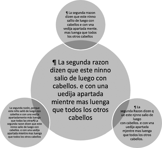Три изображения, выбранные из 27 возможных рукописей «Истории Испании», содержащих этот раздел, все представляют версию одной и той же главы, о чем я говорил выше. Быстрый просмотр показывает, что отметки на странице кажутся мало отличающимися от аналогичных в рукописи Е1. И с точки зрения печатного издания, на данном этапе они способны добавить к объекту исследований немногое. Но даже поверхностный взгляд на изображения показывает, что каждое из них имеет свою историю, что планировка и настройка текста каждого имеют свои особенности, и что в представлении издания как конструкции, построенной на архиве, каждое из них своим способом может способствовать более широкому пониманию труда, каковым является «История Испании». В этом смысле автор цифрового издания вынужден задаться вопросом, какой текст генерируется вместе с документом? Могут ли эти рукописи быть рассмотрены как что-то иное, по сравнению с имеющимся вариантом? И если да, то что это может быть?