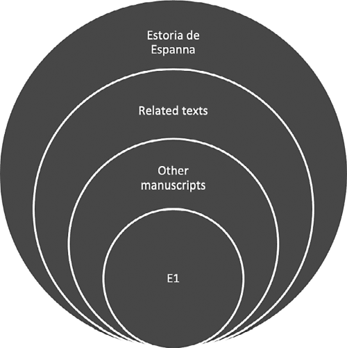 Можно справедливо возразить: то, что я описываю здесь, на самом деле не является истинным ответом на вопрос «что должно быть включено в будущие цифровые издания “Истории Испании” Альфонсо Х?». Однако в некотором смысле сам Альфонсо Х дает нам ответ на этот вопрос в знаменитом прологе к «Истории Испании»: «nos don alffonsso por la graçia de dios. Rey de Castiella. de Toledo de. Leon. De Gallizia. de Seuilla. de ordaua. de Murcia. de Iahen. E dell Algarue. Mandamos ayuntar quantos libros pudimos auer de Istorias en que alguna cosa contasse de los fechos despanna. 20 e tomamos de la cronica dell arçobispo don Rodrigo que fizo por mandado del Rey don Fernando nuestro padre. ⸆ e de la de Maestre luchas obispo de Tuy. e de paulo Orosio e del lucano. e de sant Esidro el primero. e de sant Alffonsso. e de sant esidro el mancebo. e de Idacio obispo de Gallizia. e de Sulpicio obispo de gasconna. e de los otros escriptos de los concilios de Toledo. e de don Jordan chanceller del sancto palacio. e de claudio Tholomeo que departio del cerco de la tierra meior que otro sabio fasta la su sazon. e de dion que escriuio uerdadera la estoria de los Godos. e de Ponpeyo trogo. e dotras estorias de Roma. las que pudiemos auer que contassen algunas cosas del fecho despanna. 21 e compusiemos este libro de todos los fechos que fallar se pudieron della; desdel tiempo de Noe fasta este nuestro. e esto fiziemos por que fuesse sabudo el comienço de los espannoles» (E1, 2v. EED 1.19–21) [Мы, дон Альфонсо, Божьей милостью король Кастилии, Толедо, Леона, Галисии, Севильи, Кордовы, Мурсии, Хаэна, Альгарве, сын благороднейшего короля дона Фернандо и королевы доньи Беатрис, повелеваем объединить все книги об истории, какие только можем обрести и в которых рассказывается что-либо о событиях в Испании; и возьмем хронику архиепископа Родриго, составленную по приказу короля дона Фернандо, нашего родителя, а также хронику магистра Луки, епископа Туйского, и Павла Орозия, и Лукана, и св. Исидора-первого, и св. Ильдефонса, и св. Исидора-младшего, и Идация, епископа Галисийского, и Сульпиция, епископа Гасконского; и еще труды Толедских соборов и Иордана, канцлера святого престола; и сочинение Клавдия Птолемея, описавшего круг земной лучше, чем любой из мудрецов предшествующих лет; и Диона, написавшего подлинную историю готов; и Помпея Трога и другие истории Рима, которые мы можем достать, повествующие о делах Испании; и сложим эту книгу о всех событиях в ней, которые только сумеем отыскать, от времен Ноя до нашего времени. И сделаем это, дабы было ведомо о происхождении испанцев (пер. И. В. Ершовой)].