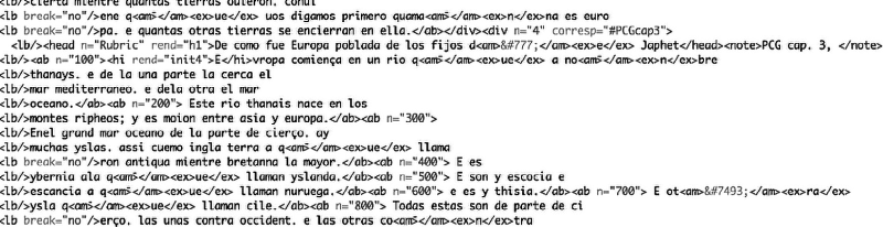 Здесь мы имеем отражение труда (сочинения), то есть «Истории Испании», и включающее документ, который, по нашему согласию, не является EE, и который, следовательно, учитывает некоторый диапазон знаний, на который я намекал выше как на составную часть издания. Однако здесь наиболее важным является то, что этическая основа организации издания не ясна, и, более того, она не позволяет установить связи между элементами свидетельств, которые непосредственно не связаны с привилегированным документом.