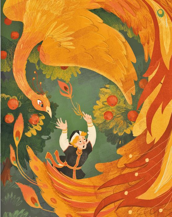 – Дорогой батюшка, поймать не поймал, а проследил, кто наш сад разоряет. Вот от похитника память вам принёс. Это, батюшка, Жар-птица.