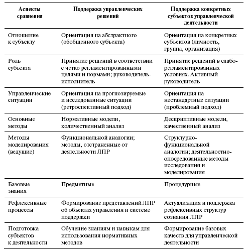 Существенные различия в ориентации подходов на поддержку управленческих решений и поддержку конкретных субъектов управленческой деятельности иллюстрируются в табл. 1.