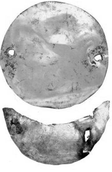 Золотые предметы в форме солнца и полумесяца, относящиеся к XIII–XIV вв. и свидетельствующие о преемственности верований и ритуалов хунну и монголов. Экспонат из Национального музея Монголии (г. Улан-Батор)