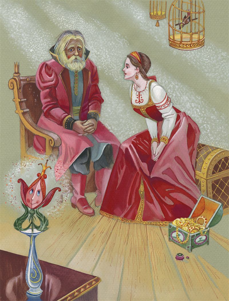 Приказал он принести сундуки дорожные, железом окованные; доставал он старшей дочери золотой венец, золота аравийского, на огне не горит, в воде не ржавеет, со камнями самоцветными; достаёт гостинец середней дочери, тувалет хрусталю восточного, достаёт гостинец меньшой дочери, золотой кувшин с цветочком аленьким. Старшие дочери от радости рехнулись, унесли свои гостинцы в терема высокие и там на просторе ими досыта потешалися. Только дочь меньшая, любимая, увидав цветочек аленький, затряслась вся и заплакала, точно в сердце её что ужалило. Как возговорит к ней отец таковы речи: