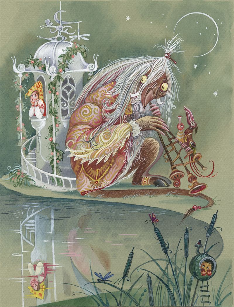 Долго, долго лесной зверь, чудо морское, не поддавался на такие слова, да не мог просьбам и слезам своей красавицы супротивным быть, и говорит ей таково слово: