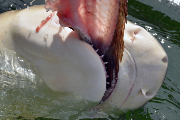Нырнул, приблизился и схватил рукой, но не очень крепко в области башки. А у неё кожа скользкая, в слизи и к тому же шипы вонзаются в пальцы. А она, естественно выкручивается, как может! И так стерва стала вибрировать, что вырвалась!