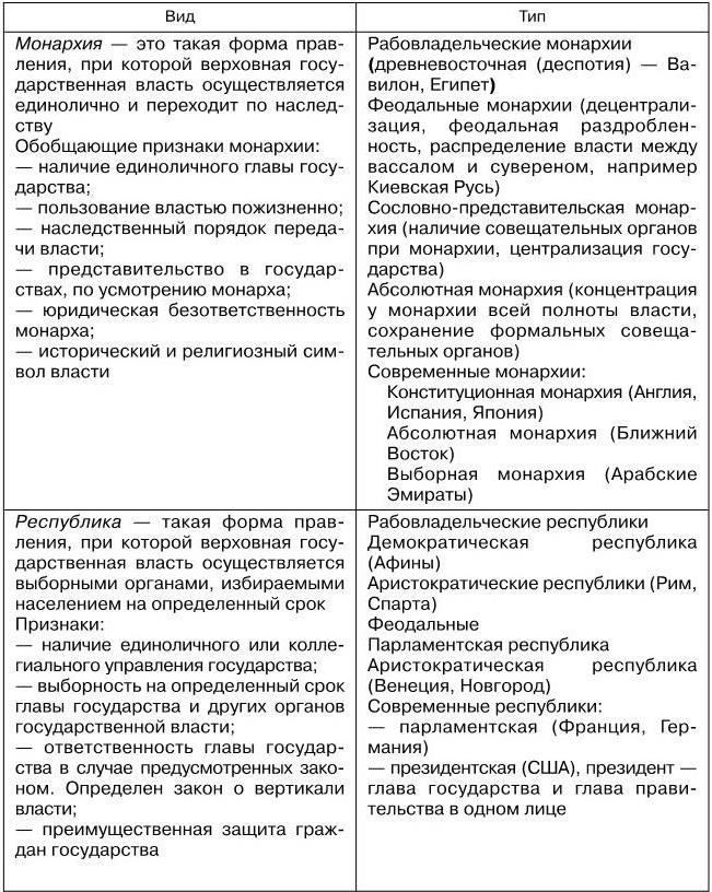 Под формой государства понимаются конкретно-исторические характеристики организации политической власти в стране. Сторонами, характеризующими форму государства, являются: форма правления, политический режим и форма устройства государства.