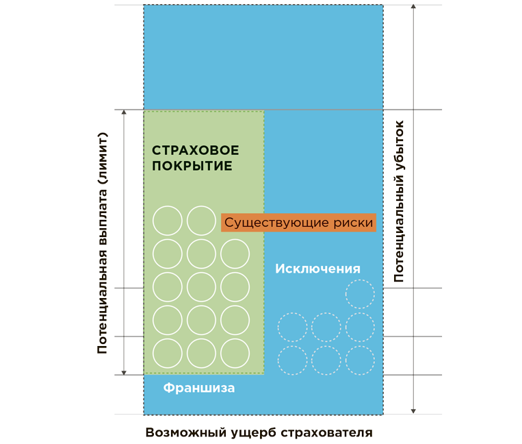 На рисунке 1.3 страховое покрытие показано в виде зеленого участка – это реализация определенных событий с финансовым ущербом в рамках между франшизой и страховым лимитом. Обратите внимание, что страховщиком покрываются не все риски и не в полном объеме.