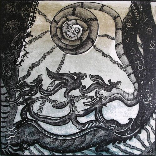 Входит Иван-царевич в терем, а там спят – по одну сторону шесть полениц – девиц-богатырок и по другую сторону шесть, а посредине разметалась девица Синеглазка, спит, как сильный речной порог шумит.