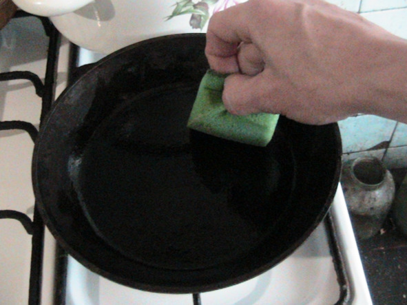 И только ЕСЛИ ГУБКА СОВСЕМ СУХАЯ, без масла, которое остаётся в ней, то только тогда на сковороду капни чуть-чуть ГОРЧИЧНОГО масла немного и после этого промажь губкой. И теперь, смазав всю поверхность -СПЕЦИАЛЬНО для этого губкой, будем жарить. Губка – как для посуды: но лежит в закрытой баночке в холодильнике– рядом с горчичным маслом. В эту же баночку-«отжать» излишки масла со сковороды, плотно закрыть баночку с губкой крышечкой и убрать в холодильник – поближе к горчичному маслу!