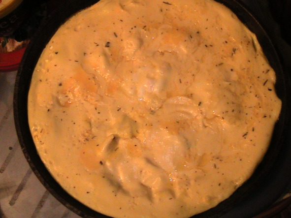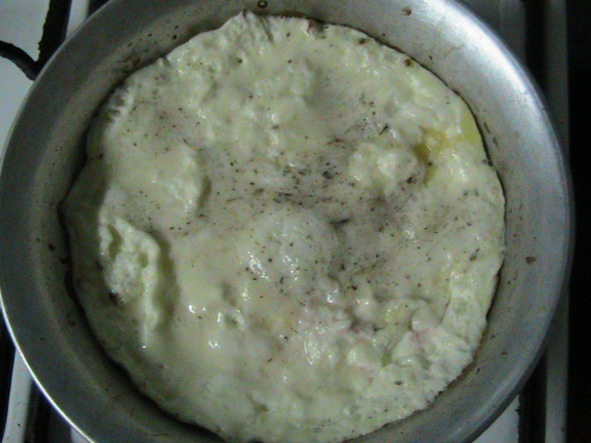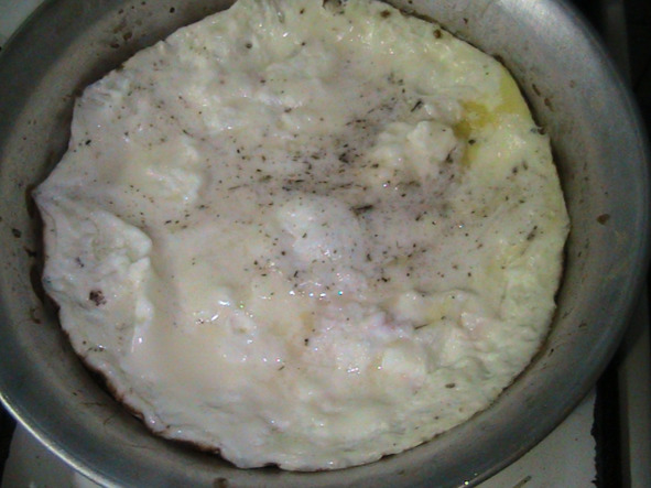 «В середине жарки, когда края уже «схватяться», а середина-ещё сырая, накрой сверху крышкой или как у меня: чуть приоткрыв, чтобы пар испаряющейся жидкости мог спокойно выходить. Готово? Тогда выключай и так и оставь под приоткрытой сверху крышкой или… чтобы не остыло-ДО САМОГО «момента употребления»!