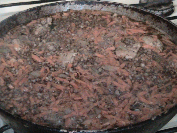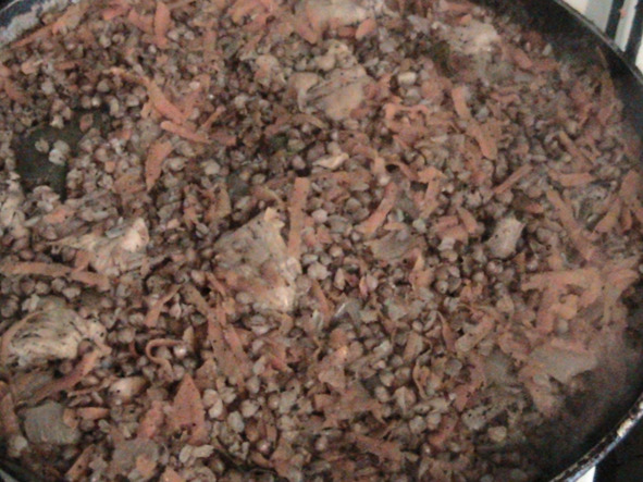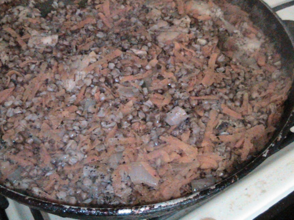 «Плов из гречки. В этот раз „жаровня для плова“ – у меня теперь уже есть! Ведь для плова – нужна именно глубокая сковородка: с высокими „бортами“! Или утятница! В маленькой чугунной – хороший, НАСТОЯЩИЙ, ароматный плов не приготовить!»