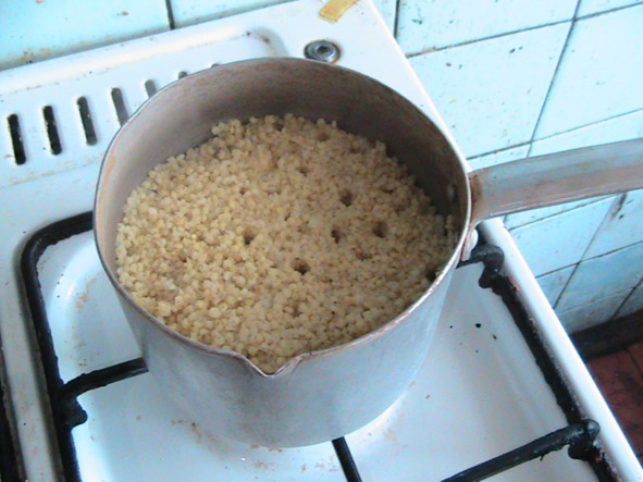 Моя кастрюлька на 2,5 литра которая. В неё налить 4 стакана холодной воды из-под крана. В неё соль: 2 чайных ложки плюс ещё 2/3 чайной ложки крупной соли. Доводим до кипения. 2 стакана пшена (пшенной крупы) промыть в холодной воде три раза. Как вода в кастрюльке закипела, засыпаем промытую крупу. Доводим до кипения, снимая пену. Как закипело, убавить огонь до самого малого и, поворошив, закрыть крышкой и пусть кипит минут 8.Затем поворошить и закрыв крышкой и пусть покипит минут 5—6. (смотри под крышку кастрюли уже после 4 минут, чтобы каша не пригорела.) Как готова (на вкус) и -ВОДА в кастрюльке почти или полностью ВЫКИПИТ (если вода ещё ЕСТЬ на дне, пусть «испариться»! ), выключить газ, накрыть крышкой и дать постоять минимум 5 минут.