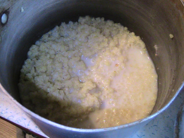 «Как „ВАРИАНТ РАЗНООБРАЗИЯ“ -добавить в тарелку с посыпанной сахаром (или нет) пшённой кашей -НЕМНОГО МОЛОКА: вот тебе и получилась „пшённая каша молочная -„БЕЗ ЗАМОРОЧЕК““!!!»