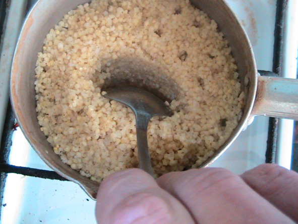 Моя алюминиевая кастрюлька с одной ручкой на 1 литр которая. Прям в эту кастрюльку засыпать 1 стакан пшена (пшенной крупы) промыть в холодной воде три раза. И так, пшено промыл. Теперь в кастрюльку с пшеном налить 2 стакана холодной воды из-под крана. В воду добавить ОБЫЧНУЮ соль (ведь возможно будем есть кашу с сахаром!): 1 чайную ложку плюс ещё 1/3 чайной ложки крупной соли. Доводим до кипения. Как вода в кастрюльке закипела, доводим до хорошего, устойчивого кипения, снимая пену. Как устойчиво закипело, убавить огонь до самого малого и, поворошив, закрыть крышкой и пусть кипит минут 8. Затем поворошить и закрыв крышкой и пусть покипит минут 5—6. (смотри под крышку кастрюли уже после 4 минут, чтобы каша не пригорела.) Как готова (на вкус) -выключить газ, накрыть крышкой и дать постоять минимум 5 минут. Есть горячей, можно посыпая сахаром. Вкус будет – как на молоке!