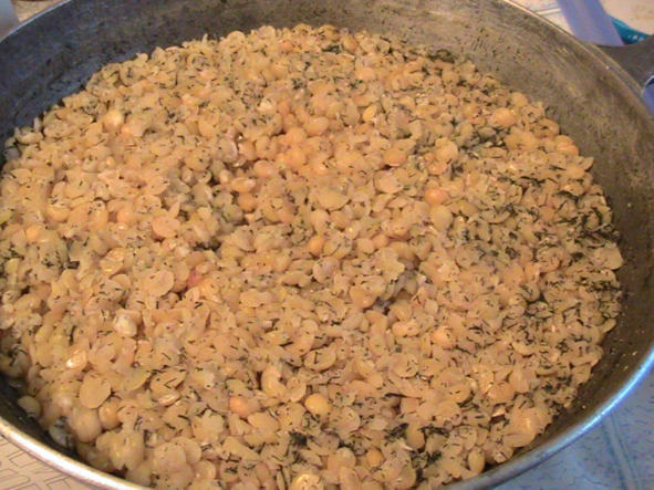 «Горох „суповой ароматный“. Налить в кастрюльку 6 стакана воды. Ставим на огонь до закипания. Берём 3 стакана обычного колотого жёлтого гороха (половинками). Промыть в трёх водах. В горячую воду в кастрюльке бросить 1 столовую ложку „адыгейской соли“. Плюс в кастрюльку ещё ложим 1 чайную ложку сахара (можно как получится: ложку с горкой). В кипящую воду бросить промытый горох, снять пену. И на самом малом огне под закрытой крышкой варим 20 минут…»