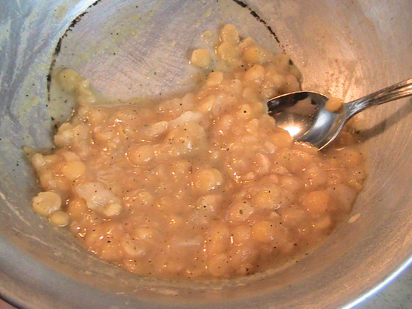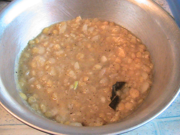 «Рецепт „горохового пюре“. Слить в тарелку почти весь оставшийся в к горохе отвар. Берём погружной блендер и измельчаем. Добавляем слитый из тарелки отвар: до желаемой густоты, по – вкусу! В тарелку с пюре можно по мере остывания, или разбавления густоты пюре, добавлять гороховый отвар из другой тарелки, поливая отваром пюре сверху. Затем можно есть пюре, перемешивая его с отваром или нет».