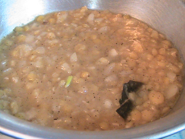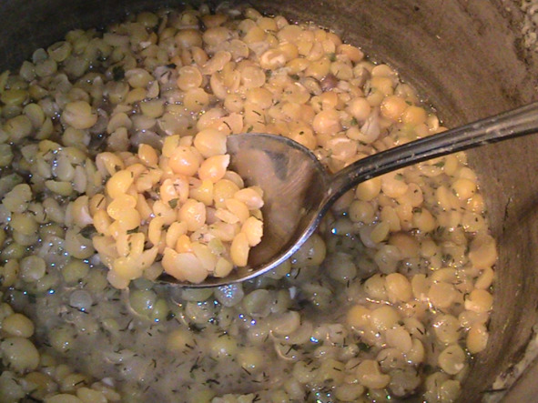 «Горох «суповой ароматный». В кипящую воду бросить промытый горох, снять пену. И на самом малом огне под закрытой крышкой варим 20 минут…«Через эти 20 минут горох на 2/3 уже разварится. Промыть под холодной водой под краном два среднего размера лавровых листа и бросить их в горох».