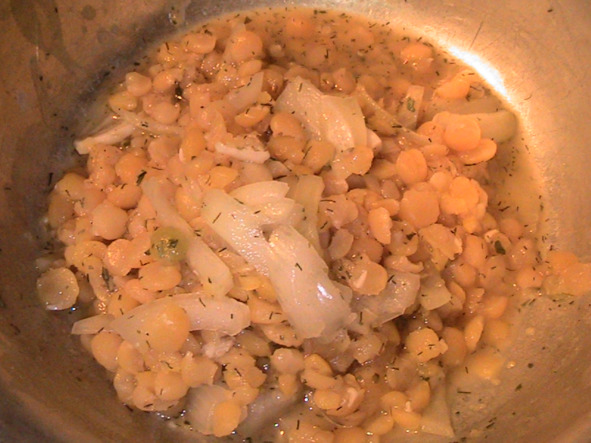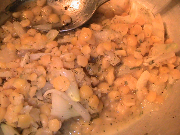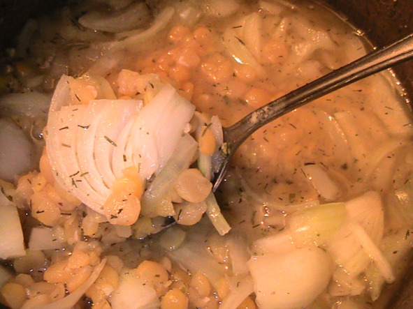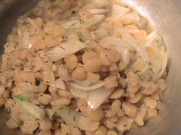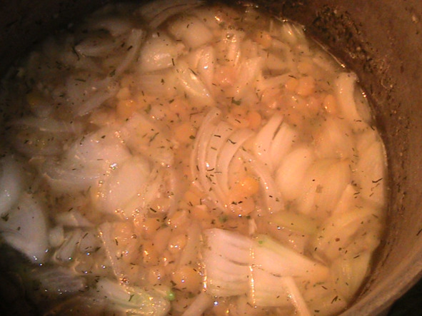 «Горох „суповой ароматный“. Если репчатый резаный полукольцами лук тоже: закинь и накрыв крышкой дай постоять 5 минут одновременно с приправами. Можно накладывать и есть!»