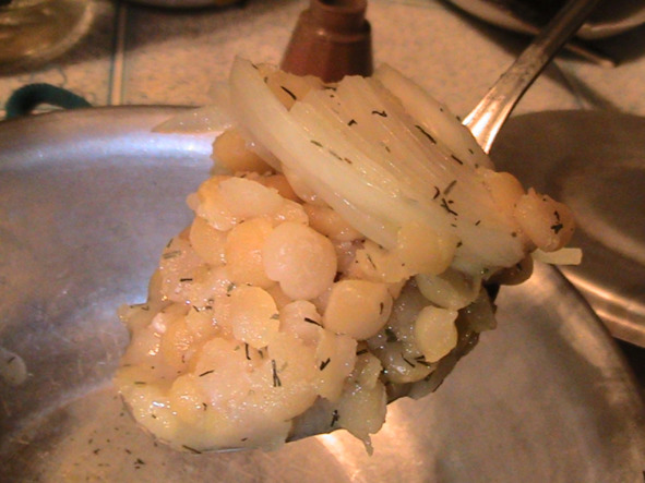 «Рецепт гороха „экзотика“. В тарелку с пюре можно по мере остывания, или разбавления густоты пюре, добавлять гороховый отвар из другой тарелки, поливая отваром пюре сверху».