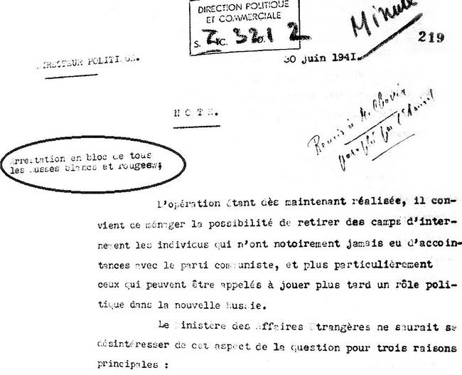 Прежде всего, во Франции в первый же день германского нападения на СССР была проведена операция, о которой практически ничего не известно у нас. Власти Виши, опасаясь проявлений возмущений со стороны эмиграции, провели массовые аресты русских эмигрантов, забирая всех под одну гребенку. Как сказано в нижеприведенном документе, намечались «массовые аресты всех русских, как белых, так и красных».