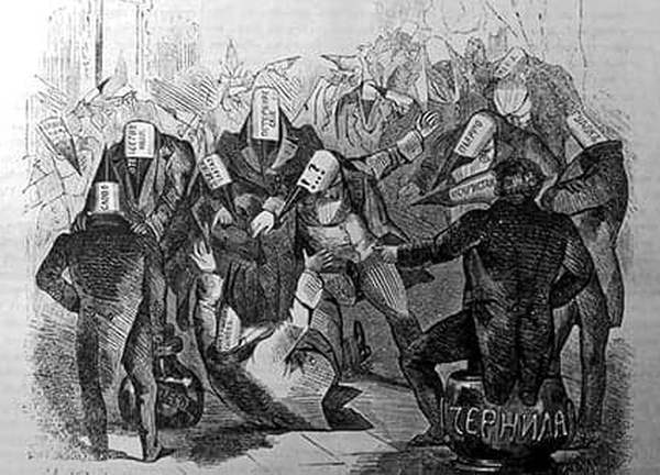 «Диспут стальных перьев». Под карикатурой, опубликованной в сатирическом журнале «Гудок» в 1859 году, значилось: «Поспорят, пошумят – и разойдутся: иные в Лету, а другие в гору». Из фондов РНБ