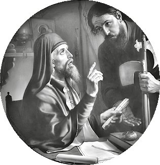 «Преподобный Дионисий Зобниновский вручает патриотическую грамоту воину – защитнику осаждённого Троице-Сергиева монастыря» (1851 год). Художник Михаил Скотти