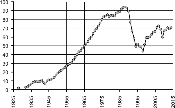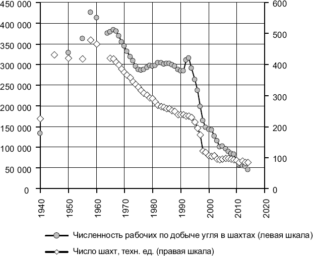 Примерно на уровень 1 погибший шахтер на 1 млн т подземной добычи новый углепром и вернулся после первого этапа реструктуризации в 2004 г. Этот уровень шахтерской смертности стабилизировался вплоть до начала 2010-х гг., хотя добыча упала вдвое и закрыты половина шахт – в основном из числа наиболее опасных (нерентабельных). Но показатель 1 погибший на 1 млн т добычи в СССР несравним с 1 чел./млн т в новой России. За время восстановительного роста 2000–2014 гг. в РФ достигнут уровень добычи РСФСР конца 1940-х гг. Тогда добыча была в основном опасной подземной, а сегодня таковой только треть. Несмотря на новые технологии управления и угледобычи, по крупным авариям в конце 2000-х гг. тоже откатили к уровню 30–40-х гг. прошлого века. Вспомним: