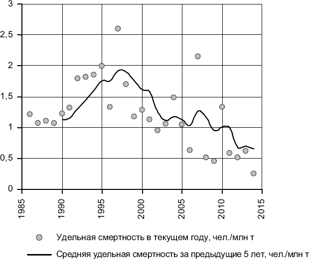 В 1991–1997 гг. удельная смертность шахтеров в среднем поднялась на 2/3, стабильно возрастала с 1,15 до 1,91 чел. на 1 млн т (усреднение за 5 предыдущих лет), а годовой максимум в 1997 г. составлял 2,6 чел./млн т. К 2003 г. удалось снизить смертность шахтеров до уровня 1991 г., вместе с тем значительно вырос разброс значений этого показателя. Если в 1990 г. разброс составлял ±6 %, то в относительно благополучном пореформенном 2009 г. – уже ±65 %. Поэтому, например, скачок удельного числа погибших с 0,45 чел./млн т в 2009 г. до 1,31 чел./млн т в 2010 г. теперь вполне «нормален».