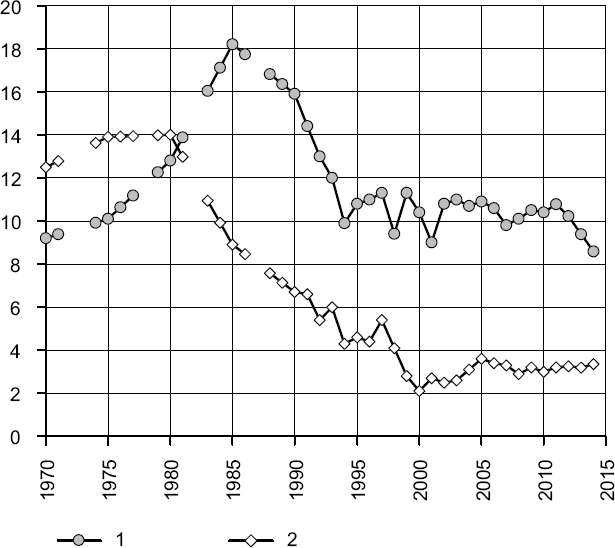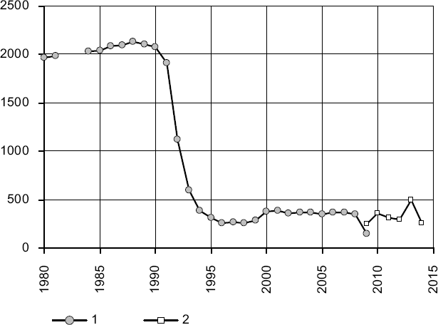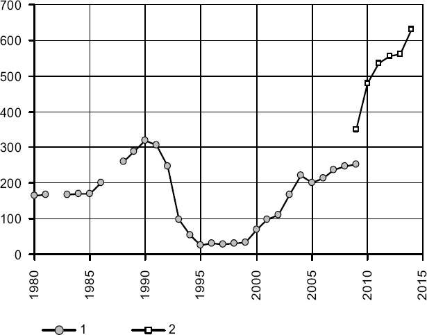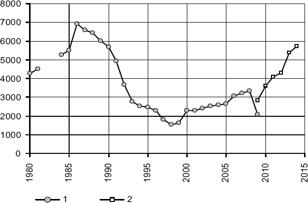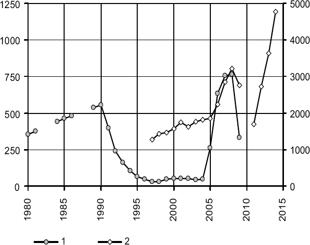 Рис. 29. Производство сортовой арматурной стали в РСФСР и РФ, тыс. т: 1 – упрочненной (левая шкала, после 2009 г. показатель не публикуется); 2 – периодического профиля (правая шкала)