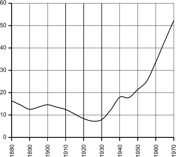 Рис. 20. Удельная смертность в подземной добыче угля в РСФСР и РФ, чел. на млн т добычи