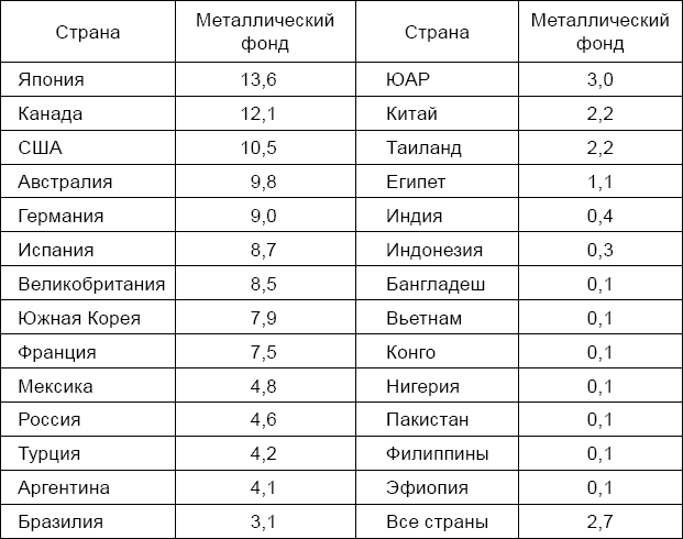 По данным доклада 2012 г. The World Steel Association «Sustainable steel: at the core of a green economy», на 2005 г. металлический фонд РФ составлял 44 % металлического фонда США (табл. 5).