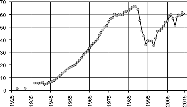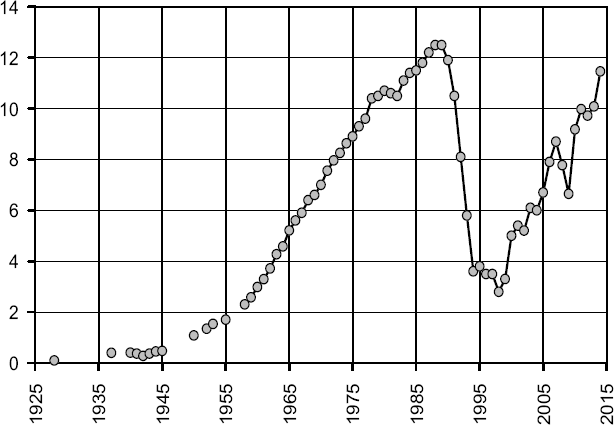 В настоящее время государственные расходы в России в большой степени обеспечивается экспортом нефти и газа. А значит, работой нефте– и газодобывающей промышленности и магистральным трубопроводным транспортом. Для поддержания этой системы в рабочем состоянии, не говоря уже о ее развитии, требуются регулярные поставки стальных труб. В 1980-е гг. в РСФСР было создано современное трубопрокатное производство. За годы реформы выпуск продукции резко упал – более чем вчетверо. На рис. 31 показана динамика производства стальных труб. После оживления производства в 1998 г. происходил неустойчивый рост примерно в дореформенном темпе, и к середине 2010-х гг. объем производства достиг уровня середины 1980-х гг. – отставание примерно на 30 лет. В начале 2010-х гг. доля электросварных труб большого диаметра в общем производстве стальных труб составляла около 30 %.