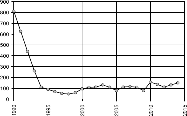 В первую пятилетку реформ производство меди, свинца и цинка сократилось вдвое (рис. 33). К 2000 г. производство меди и свинца было восстановлено. В 2013 г. производство меди превышало дореформенный уровень на 3 %, свинца – на 12 %, а по цинку отставало на 23 %.