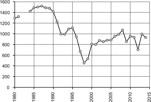 В производстве стеклопластиков спад оказался гораздо более глубоким – в 1997 г. уровень производства упал, по сравнению с достигнутым в 1980-е гг., в 7 раз (рис. 38). Оживление, наблюдаемое начиная с 2000 г., не стало значительным, производство стеклопластиков стабилизировалось на уровне в 4 раза меньшем, чем до реформ (после 2010 г. показатель Росстатом публикуется в Единой межведомственной информационно-статистической системе с отсутствующими значениями).