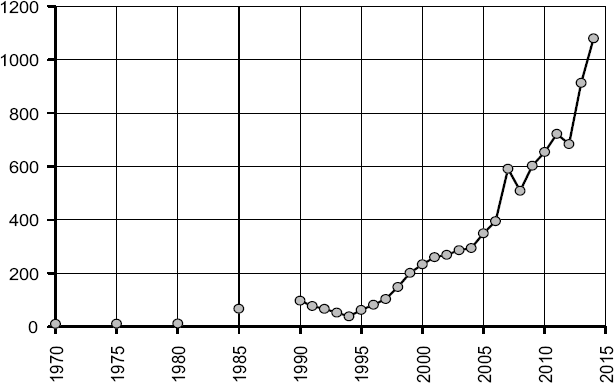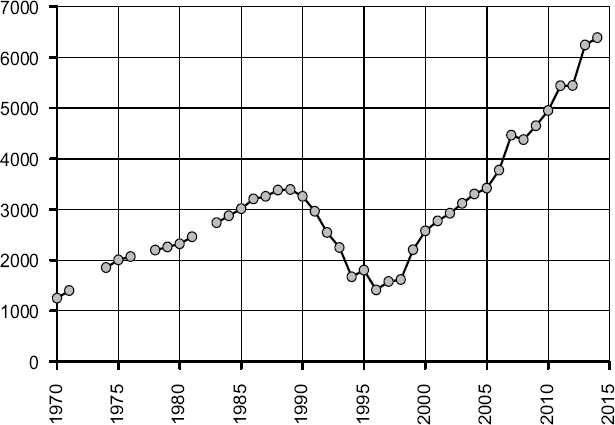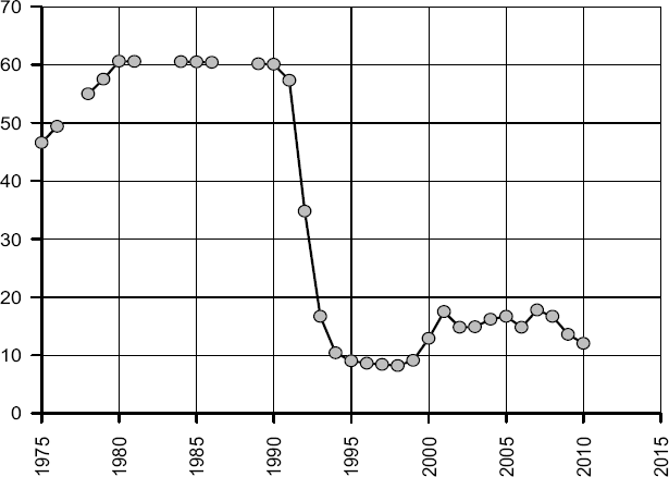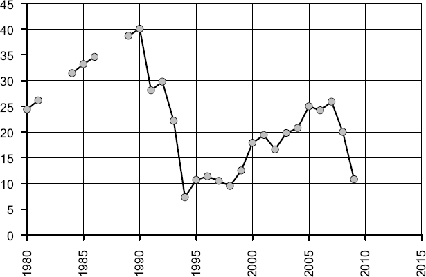 Реформа вызвала обвальное падение производства, которое стало расти, лишь начиная с 1999 г. (рис. 30). После 2009 г. показатель не публикуется.