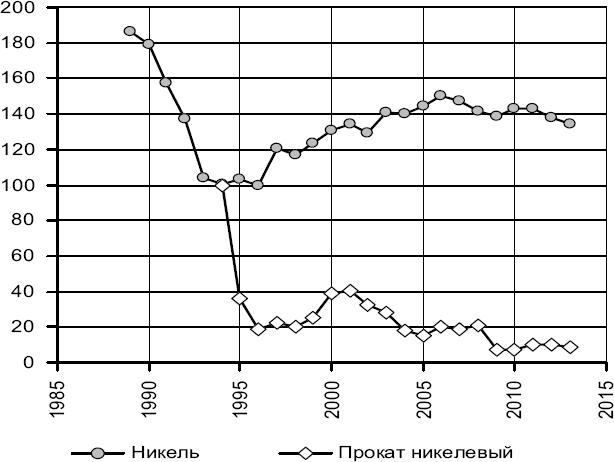 Производство проката из никеля в начале 2010-х гг. практически свернуто даже по сравнению с 1994 г. Производство никеля пострадало в меньшей степени (рис. 35): сократившись к 1996 г. почти вдвое, в начале 2010-х гг. было восстановлено на уровне 70–75 % от дореформенного.