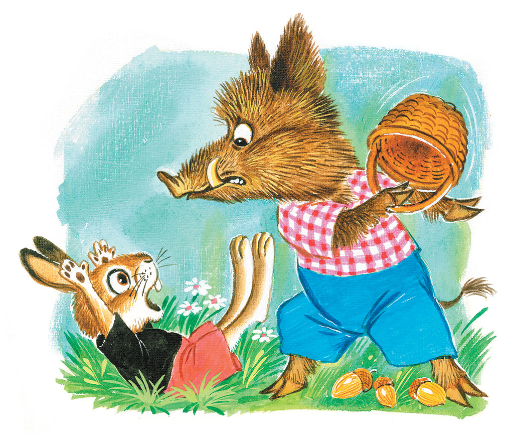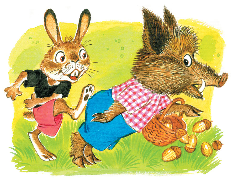 Подошёл Заяц сзади к Кабану и дал ему пинка. Рассвирепел Кабан. Обмерла от страха Зайчиха, глаза закрыла… А Заяц спокойно лёг на землю, лапки кверху поднял и закричал: