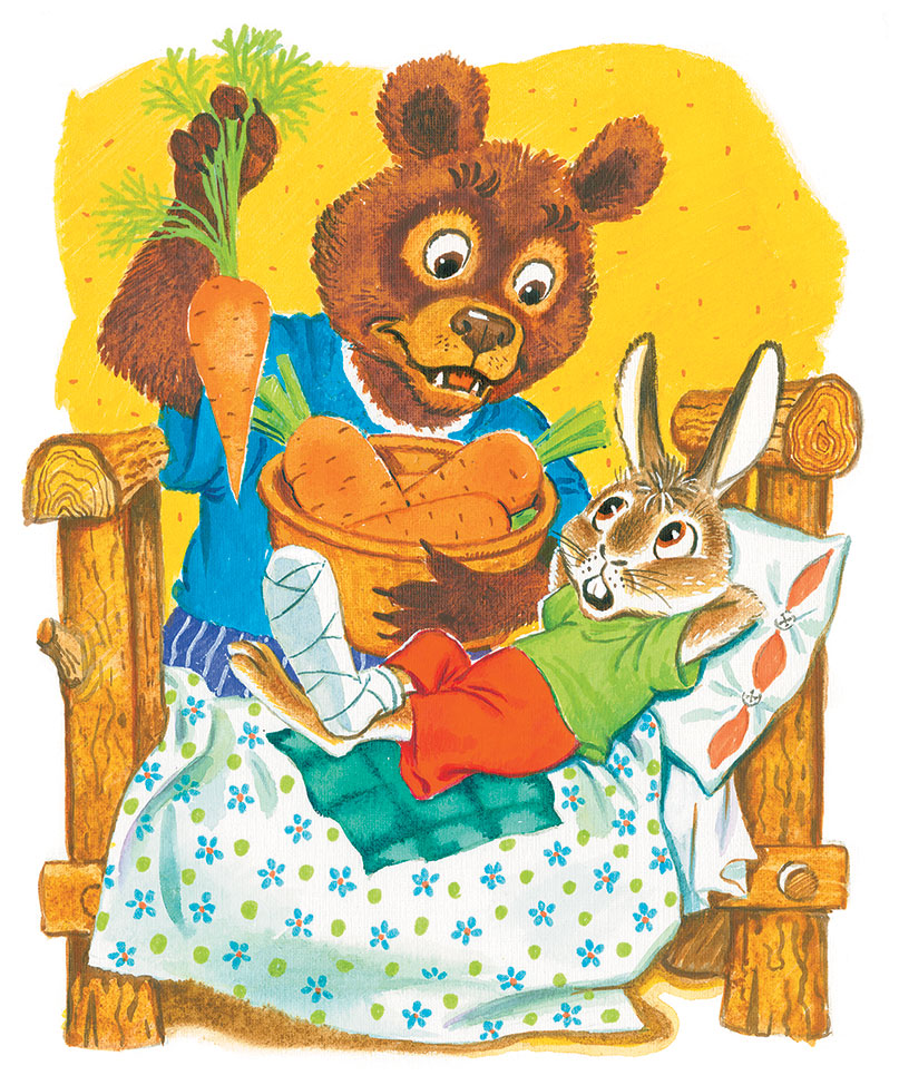 Взял Медведь Зайца и отнёс к себе в берлогу. Положил на свою койку. Стал Зайцу лапку перевязывать.