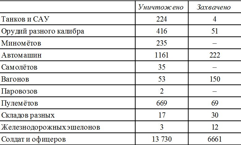 За время с 16 апреля по 29 апреля 1945 г. корпус уничтожил и захватил живой силы и техники противника: солдат и офицеров – 8450, танков и самоходных орудий – 103, орудий разных калибров – 262, миномётов – 62, много другого военного имущества и боевой техники.