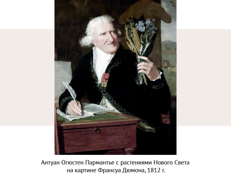 Но нас интересуют не монаршие особы, а простой французский фармацевт Антуан Огюстен Пармантье. Он тоже воевал и попал в плен. Оказавшись в плену у любителей картошки из Пруссии, он приготовился к голодной смерти. Просидев в плену три года на картофельной диете, он, к своему удивлению, не умер, вдобавок избежав проказы. После освобождения Пармантье решил заняться пропагандой картофеля. В 1774 году он опубликовал работу «Examen chymique des pommes de terre», где убедительно доказывал питательную ценность картофеля.